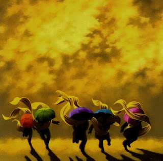 J'ai toujours été attirée par ces toiles, les couleurs sont si vives, lumineuses, remplies de magie, de mystères! Bien connu pour ses parapluies assurément, il aime peindre également sous les thèmes de foulards qui s'envolent, amoureux, personnages, faunes et il peint ses toiles tel un génie.